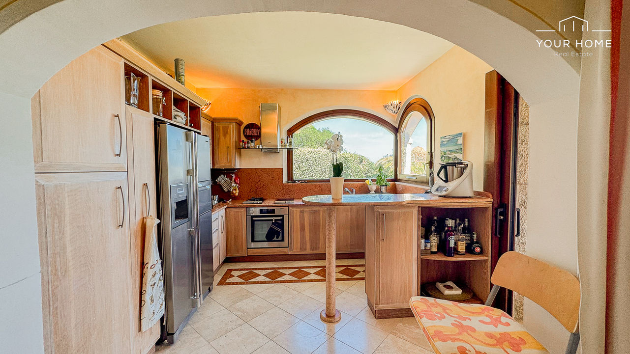 The entrance leads us into the large living space, the living room, which is divided into the living room that has fine sofas, dining area and Mediterranean-style eat-in kitchen, the latter (like everything else) of high quality is clad in wood and marble and has a bar area. A first bathroom and separate laundry room are also accessed from the living room.
